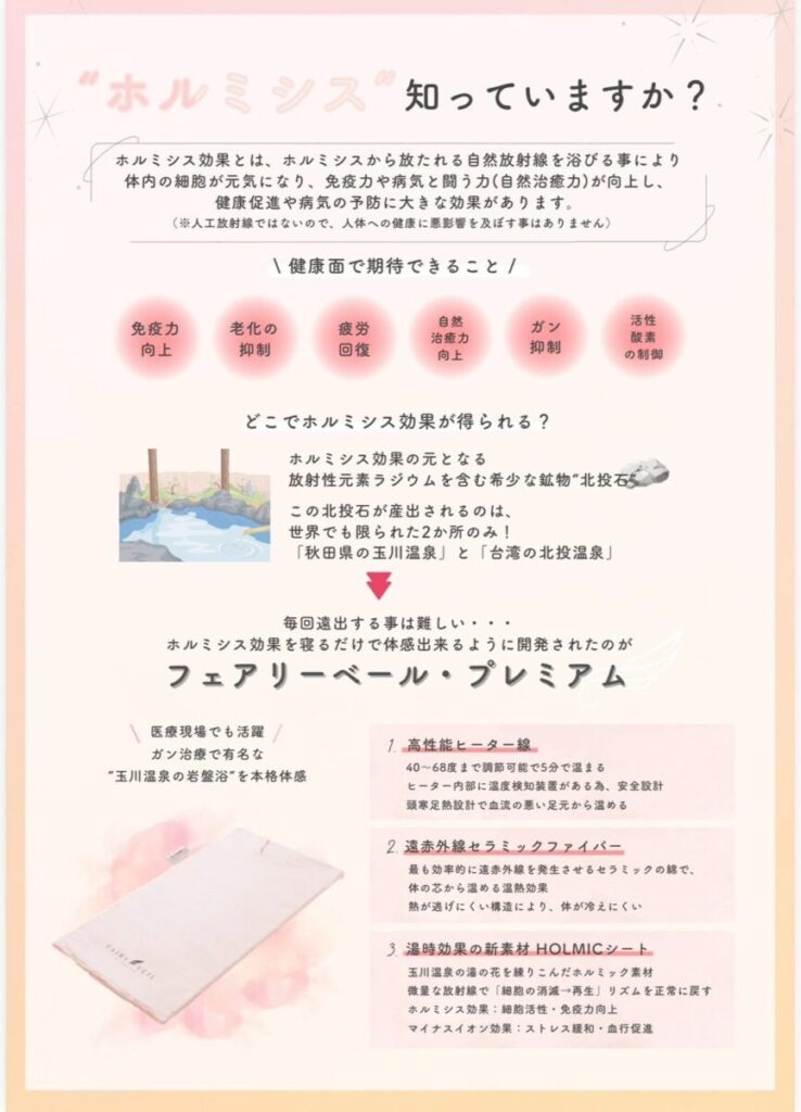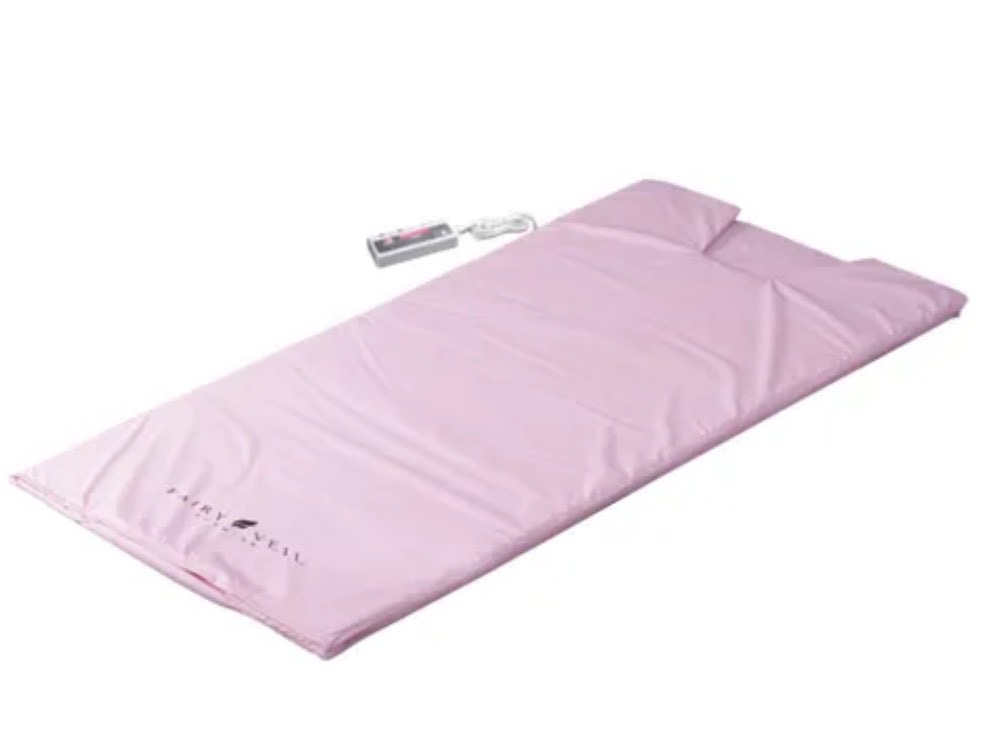 フェアリーヴェール プレミアムは、玉川温泉の湯の花を特殊製法にて加工した新素材HOLMICシートの放射線、セラミックファイバーの遠赤外線と優れた速熱性、業務用としても最高レベルの発熱温度60度にもなる温熱性で、あなたのダイエットを力強くサポートします。マット素材は変質しにくく肌触りもなめらかな耐熱ウレタンフィルムを採用した最上級のヒートマットです。